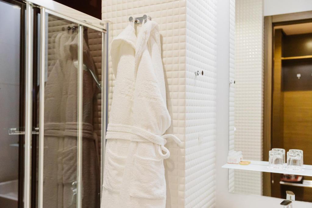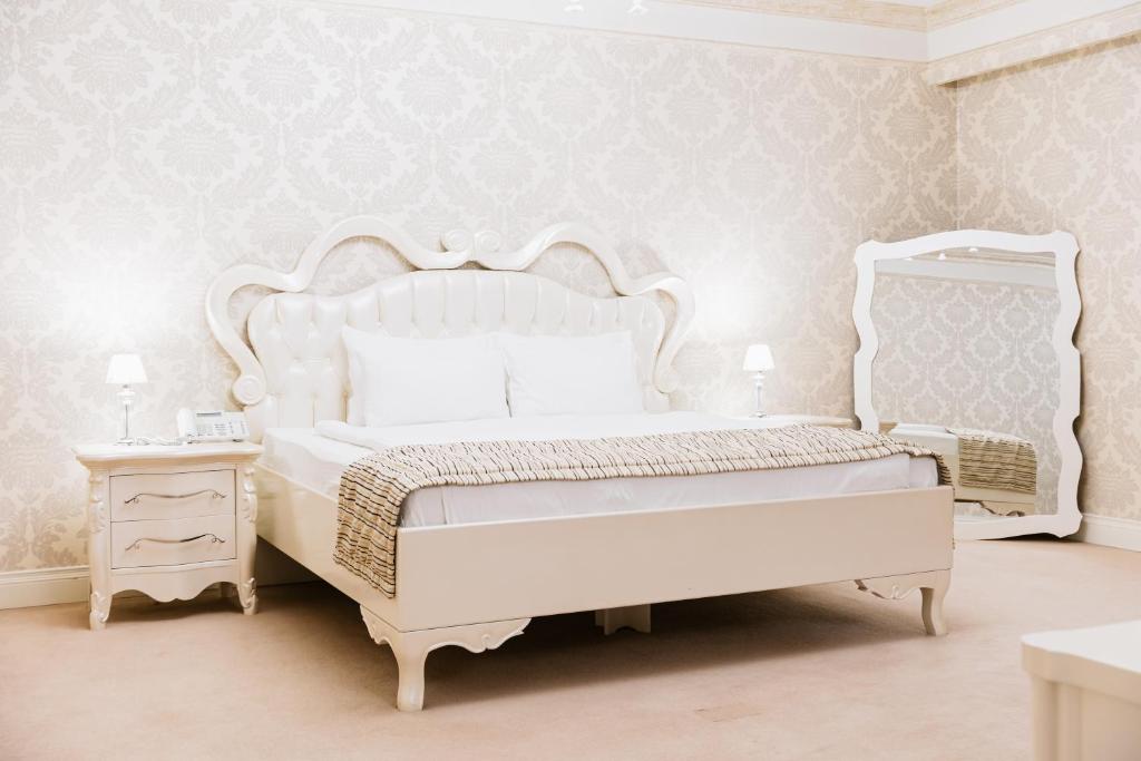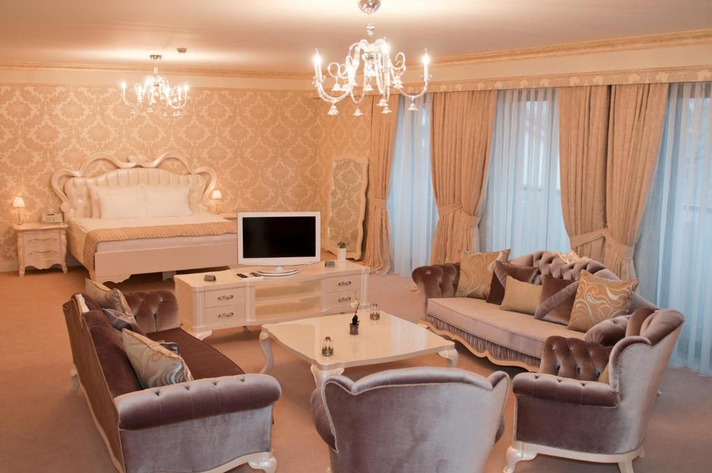 Equipped with AC, free Wi‑Fi, flat-screen TV, minibar, safe, seating area and premium bedding; some suites include sauna or Swarovski chandeliers.
