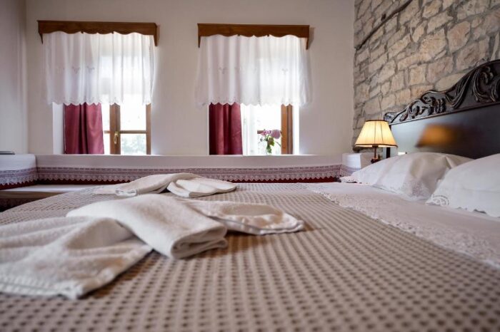 16 individually styled rooms, including Superior doubles, triples, and traditional suites, each with carved wooden ceilings, stone walls, and wood furnishings